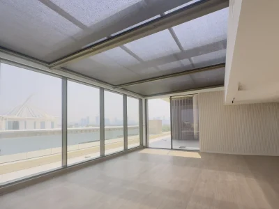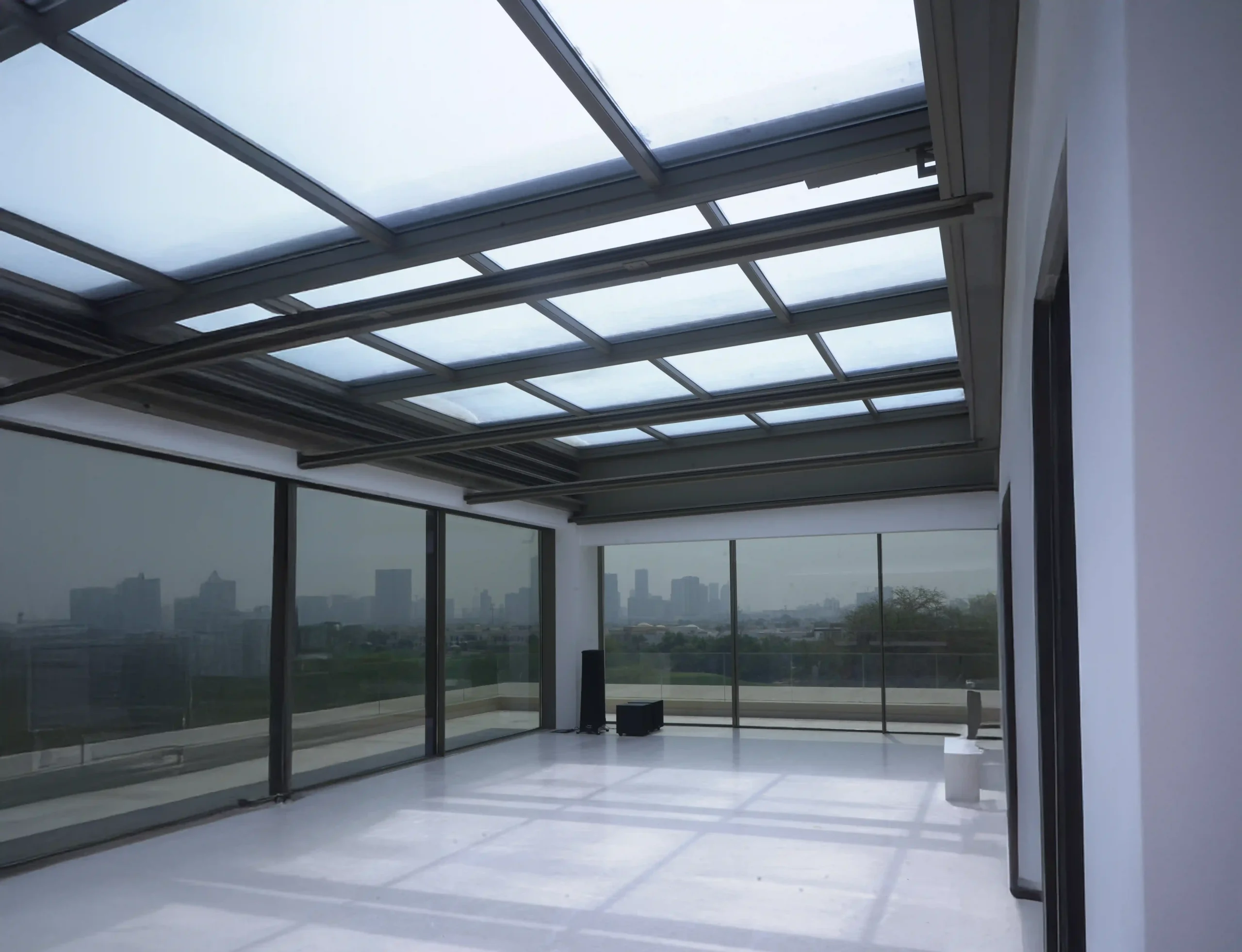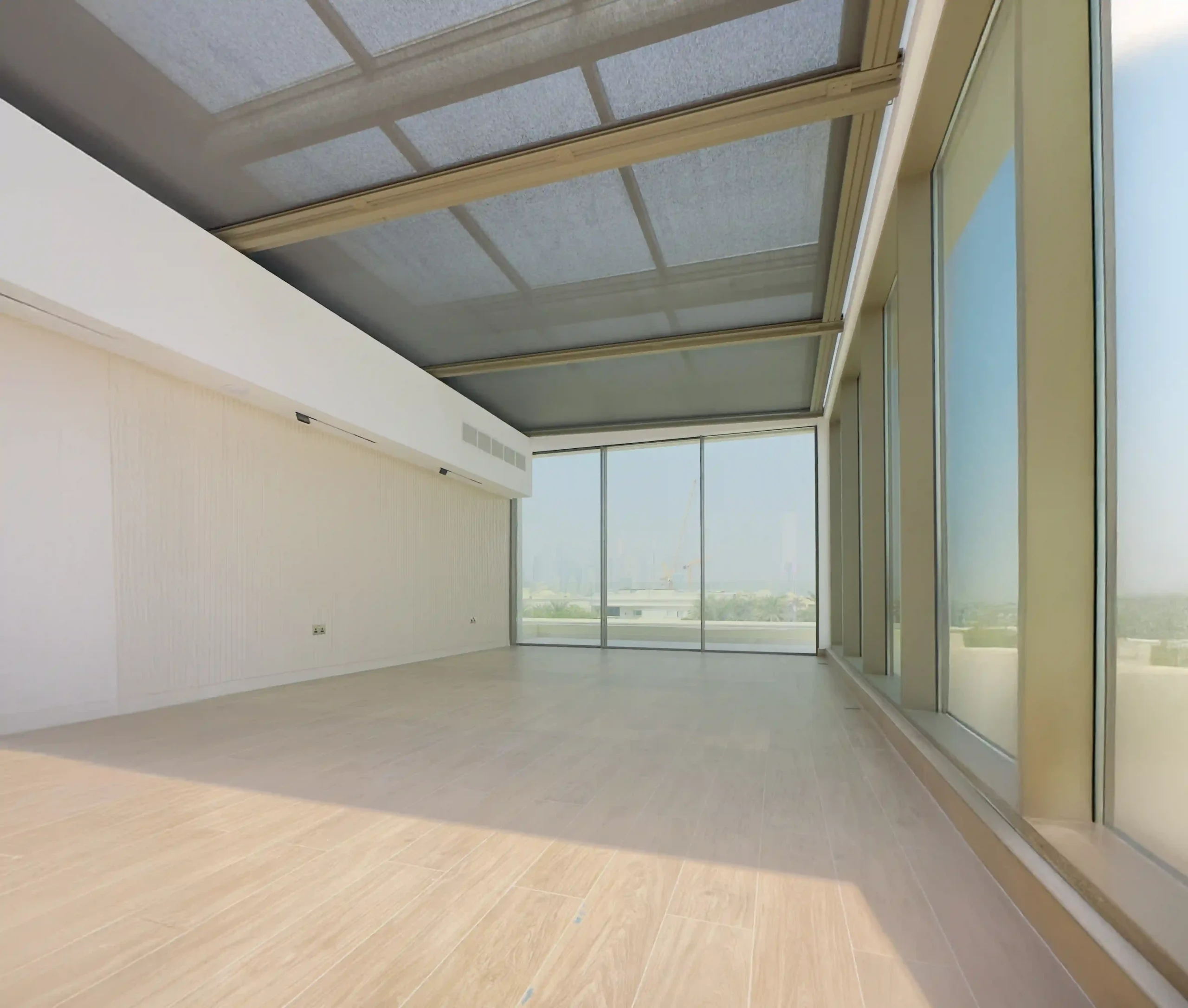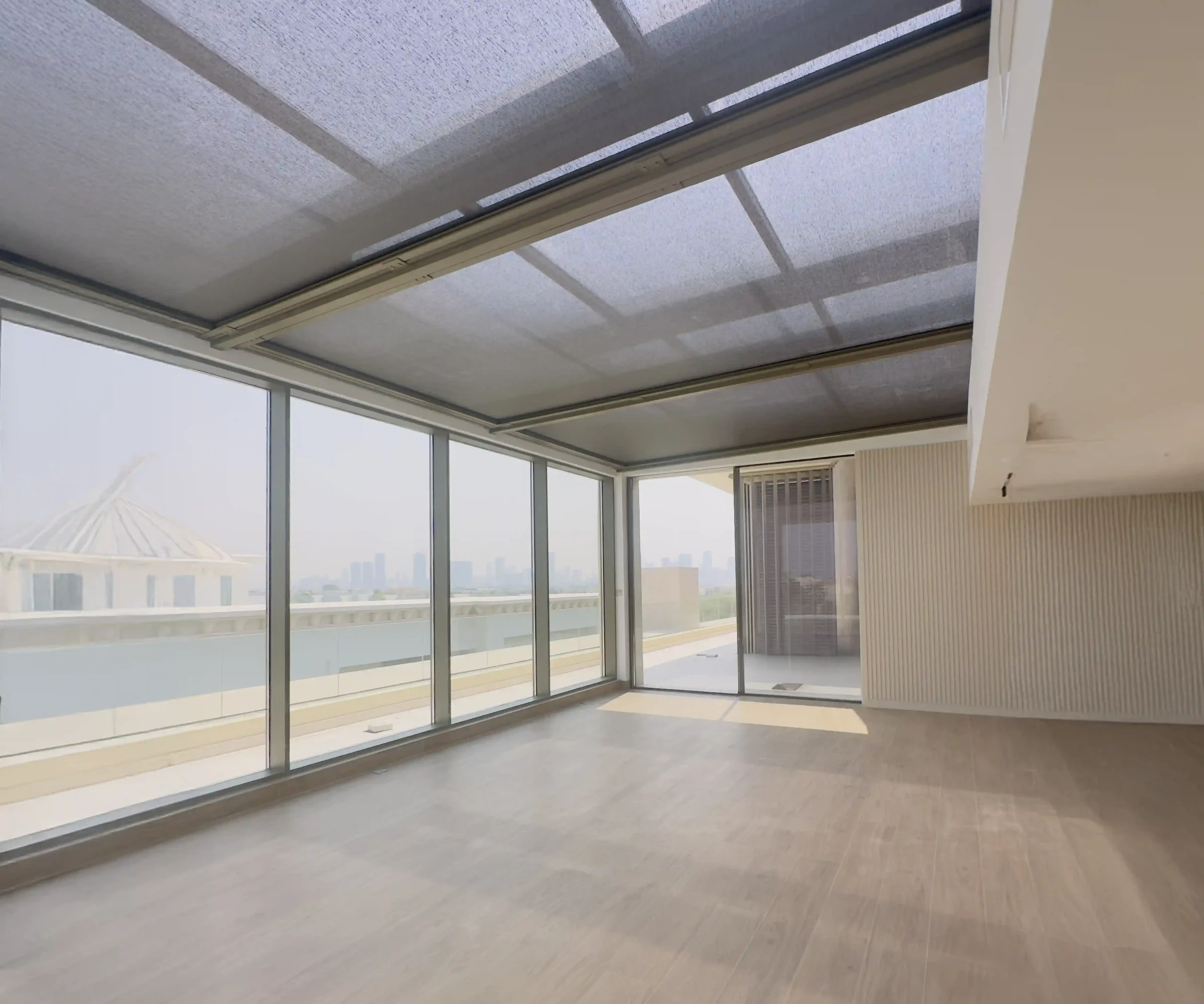 The scope of work included the supply, fabrication, and installation of a retractable sunroof system, expansive sliding doors, and a sophisticated shading solution. The retractable sunroof system introduces an abundance of daylight and fresh air, transforming the villa’s living spaces into bright and breathable environments. With the touch of a button, the sunroof smoothly glides open to invite the outdoors in, creating a dynamic space perfect for relaxation or entertaining.