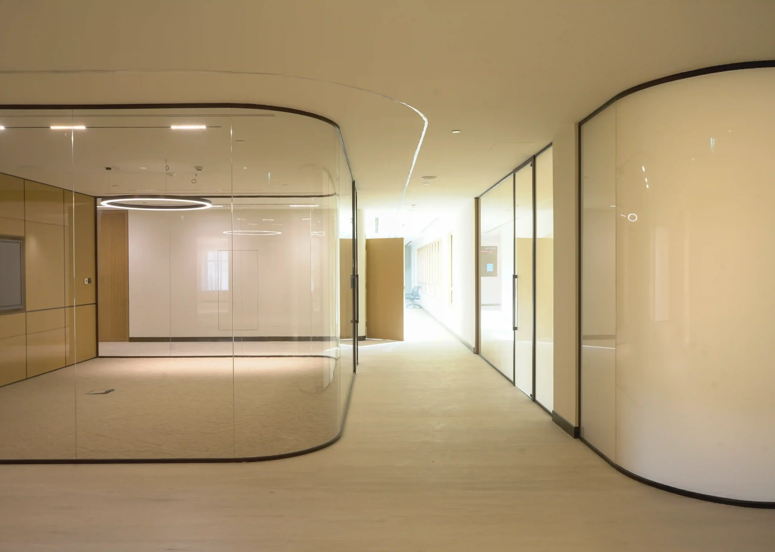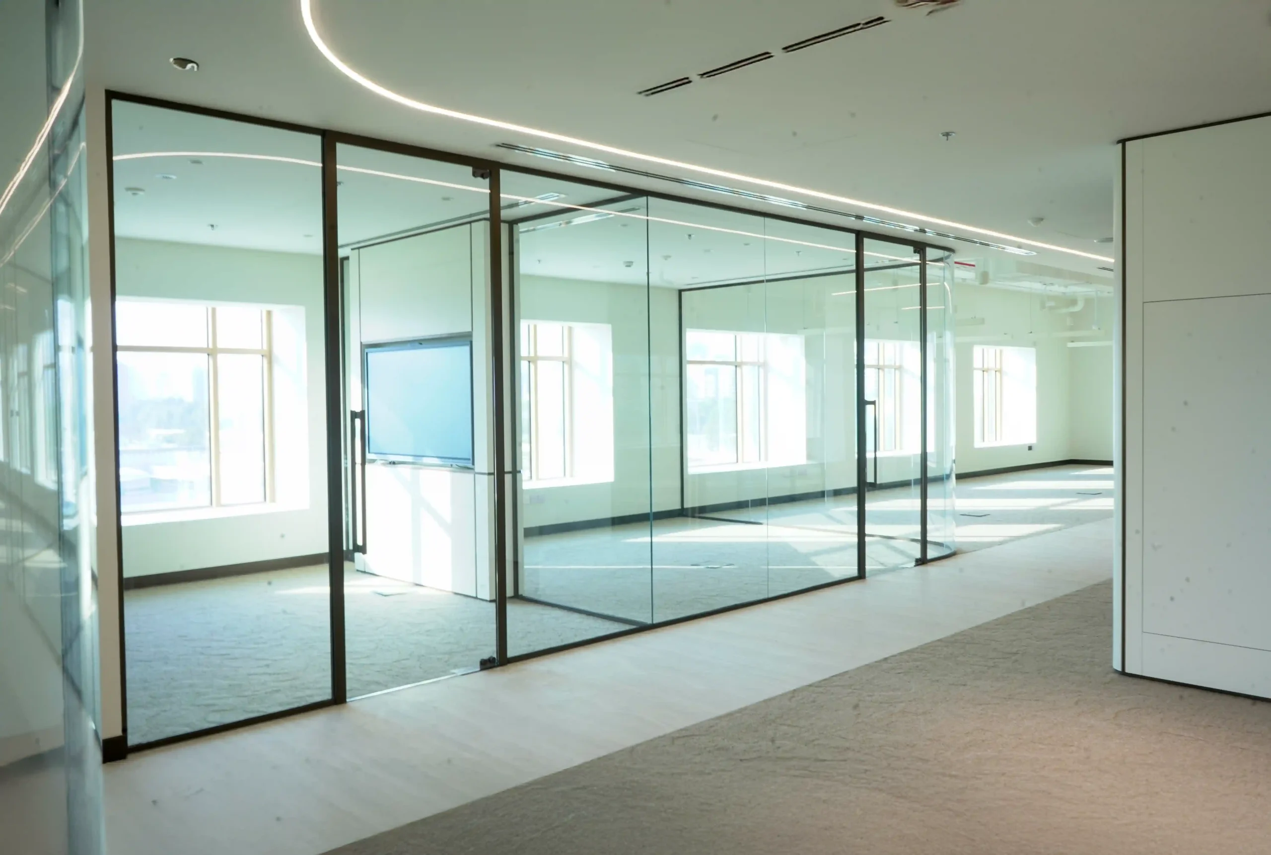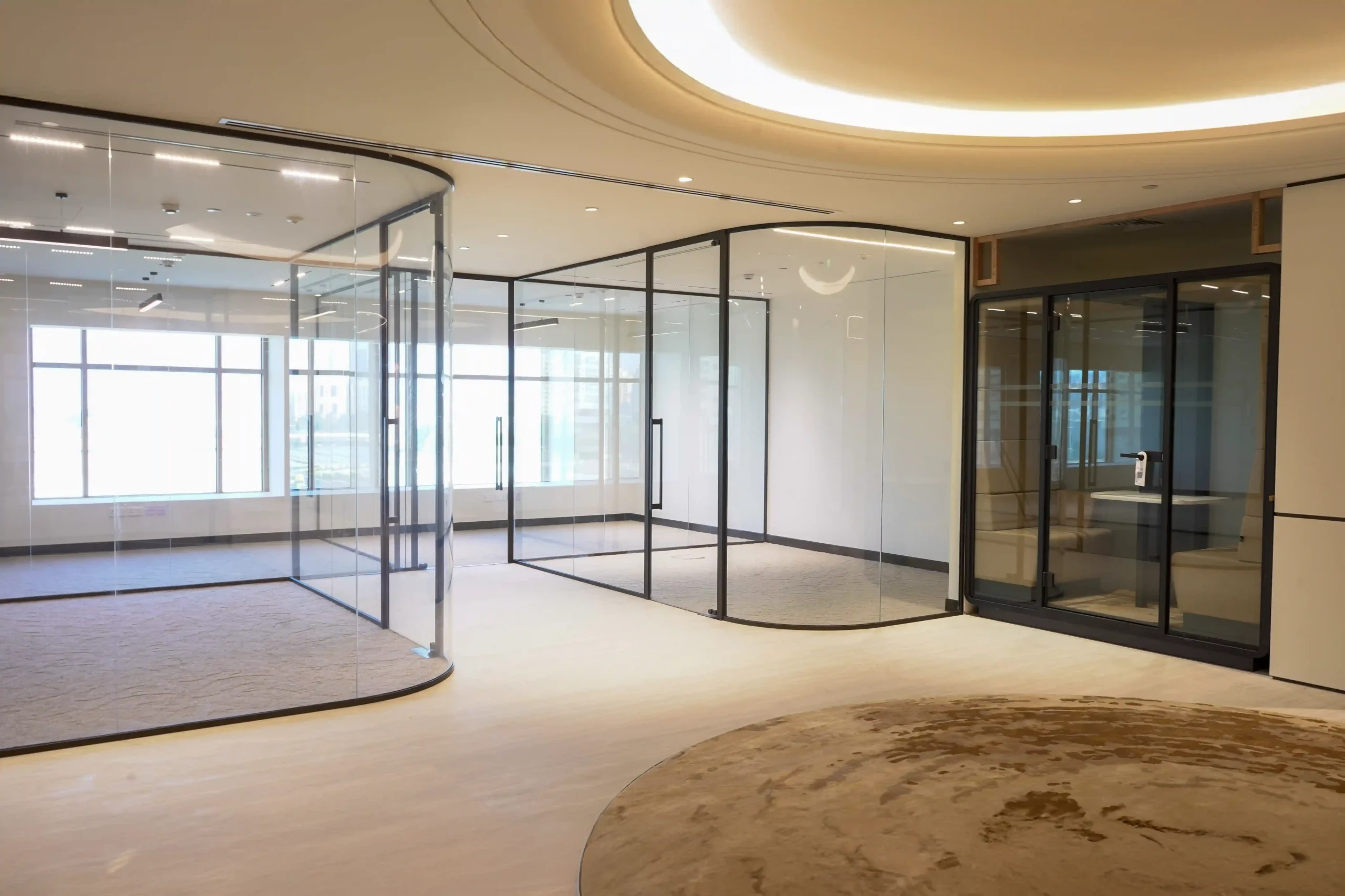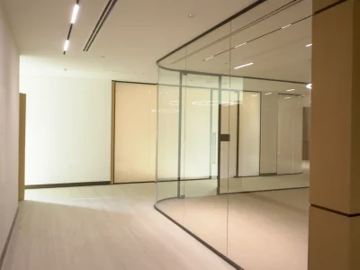 At the Ministry of Community Development offices in Dubai, our mission was to create an environment that embodies both openness and refinement. The project, spanning the 3rd and 4th floors, called for the installation of our VEE Aluminium Partitioning System, a solution designed not just for function but for a seamless blend of privacy and light. The space was transformed with elegantly curved glass panels that followed the rhythm of the building’s elevation, creating a soft, fluid visual flow that reflected the ministry’s forward-thinking spirit.